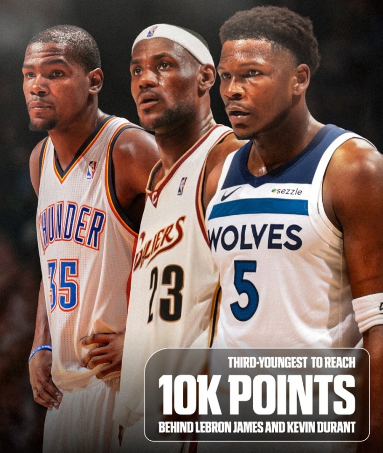 本场比赛过后,爱德华兹(24岁零157天)超越科比(24岁零194天)成为NBA史上第三年轻的万分先生,仅次于詹姆斯(23岁零59天)和杜兰特(24岁零33天)。